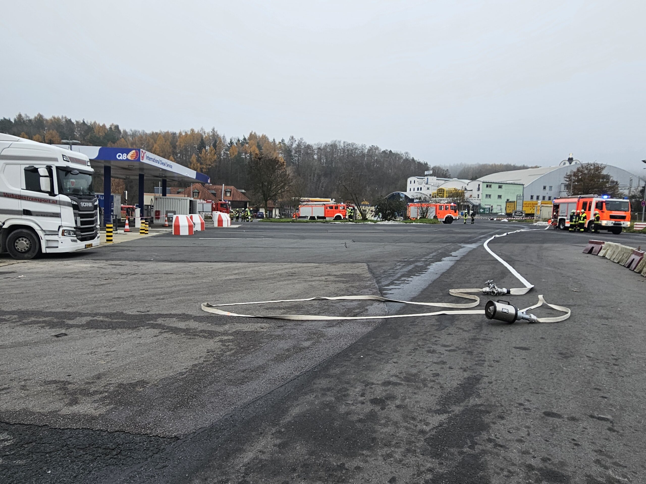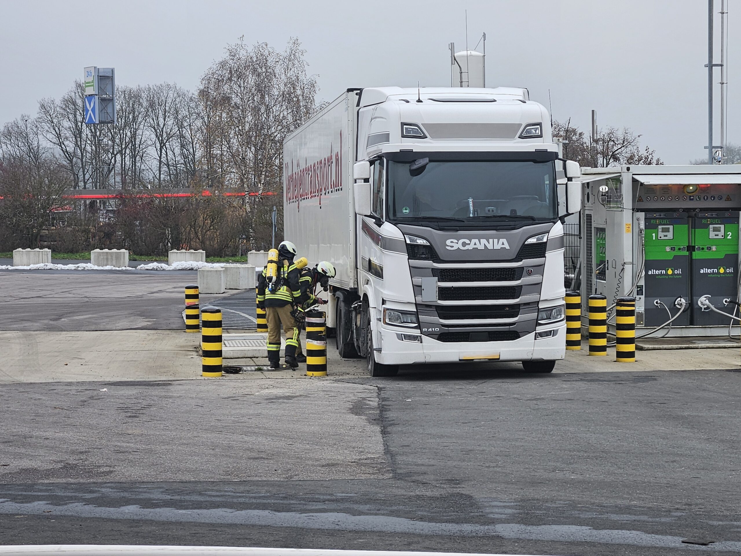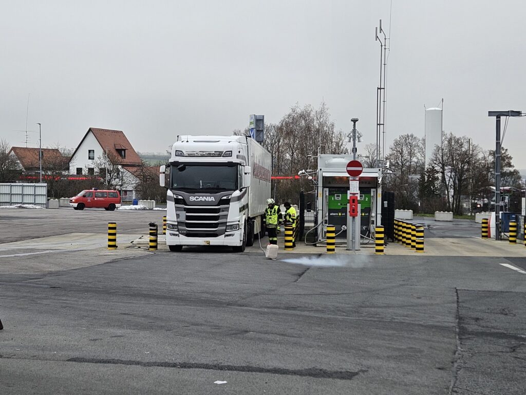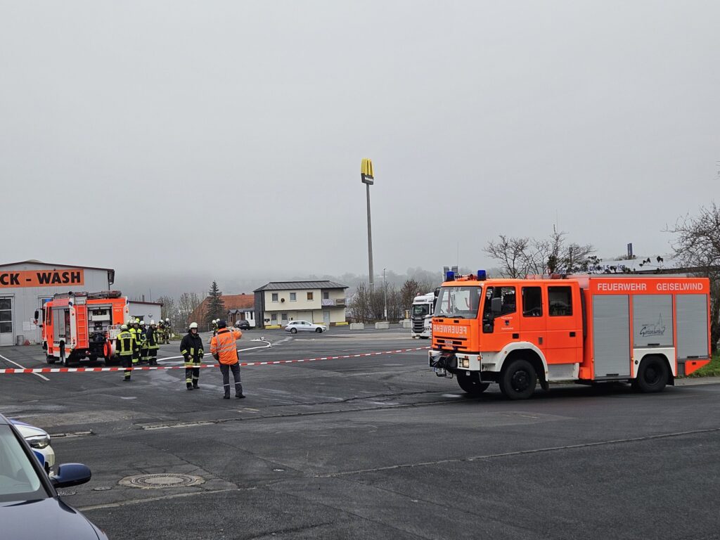 Heute wurden wir zusammen mit mehreren Feuerwehren auf den Autohof Strohofer mit dem Alarmstichwort ABC 3, Gasaustritt brennbar,  in Geiselwind alarmiert. Vor Ort trat aus einem Gastank einer Sattelzugmaschine LNG-Gas aus. Der Fahrer war beim Herausfahren aus der LNG-Tankstelle an einem Absperrpoller hängen geblieben. Dabei hat er sich die Abgasanlage und einen Gastank beschädigt, welcher im Anschluss undicht war. Die Einsatzstelle wurde daher abgesperrt, der Brandschutz sichergestellt und von einem Trupp unter PA mit Gasmessgeräten erkundet. Da der Gasaustritt nicht gestoppt werden konnte, wurde das Gas mit einem Adapter und Schlauch abgelassen. Diese Spezialarmatur musste von der Polizei Bamberg von einer Fachwerkstatt aus Strullendorf  gebracht werden. Währenddessen mussten die Zufahrten zu den Tankstellen in unmittelbarer Nähe zum Havaristen komplett gesperrt werden. Nach dem Abbau der Verkehrsabsicherung und der Übergabe an den Grundstückseigentümer konnten wir wieder einrücken.