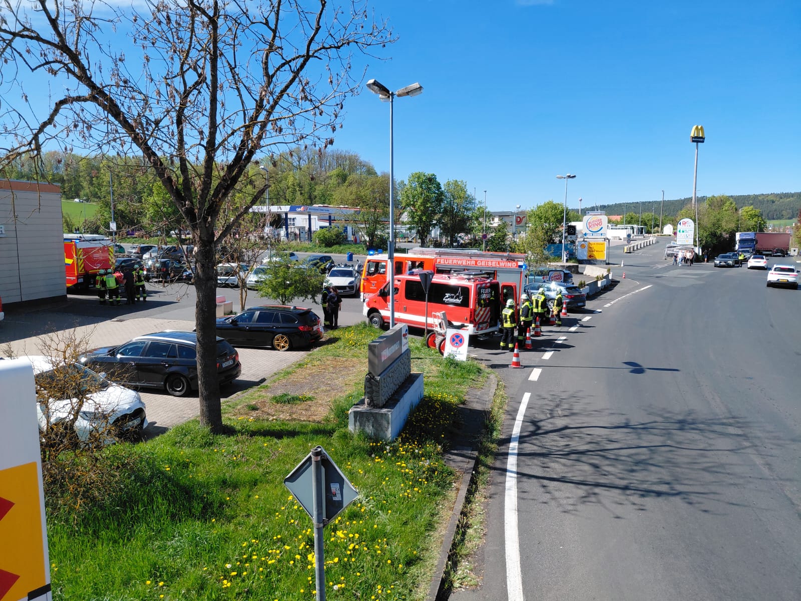 Der zweite Einsatz des Samstages führte uns zu einer ABC 2, Gasaustritt im Gebäude, in das Burger King Restaurant in Geiselwind. Beim Eintreffen der ersten Kräfte war das Restaurant bereits durch das Personal geräumt worden. Angestellte berichteten von einem zischenden Geräusch im Kellerbereich. Ein stechender Geruch war nicht feststellbar, was auf ein farb- und geruchloses Gas hindeutete. Unverzüglich wurde eine weiträumige Absperrung rund um das Gebäude und den Parkplatz eingerichtet. Der Brandschutz wurde sichergestellt. Ein Trupp unter schwerem Atemschutz ging mit einem Mehrgaswarngerät zur Erkundung in das Untergeschoss vor. Als Quelle wurde eine defekte CO² Flasche der Schankanlage identifiziert. Die Flasche wurde zur kontrollierten Entspannung ins Freie verbracht. Zur Beseitigung des Gases (das schwerer als Luft ist und sich am Boden sammelt) im Gebäude wurden gezielte Belüftungsmaßnahmen mittels Hochleistungslüfter im Keller und im Erdgeschoss durchgeführt. Nach Abschluss der Lüftung erfolgten mehrfache Freimessungen in allen Räumlichkeiten.