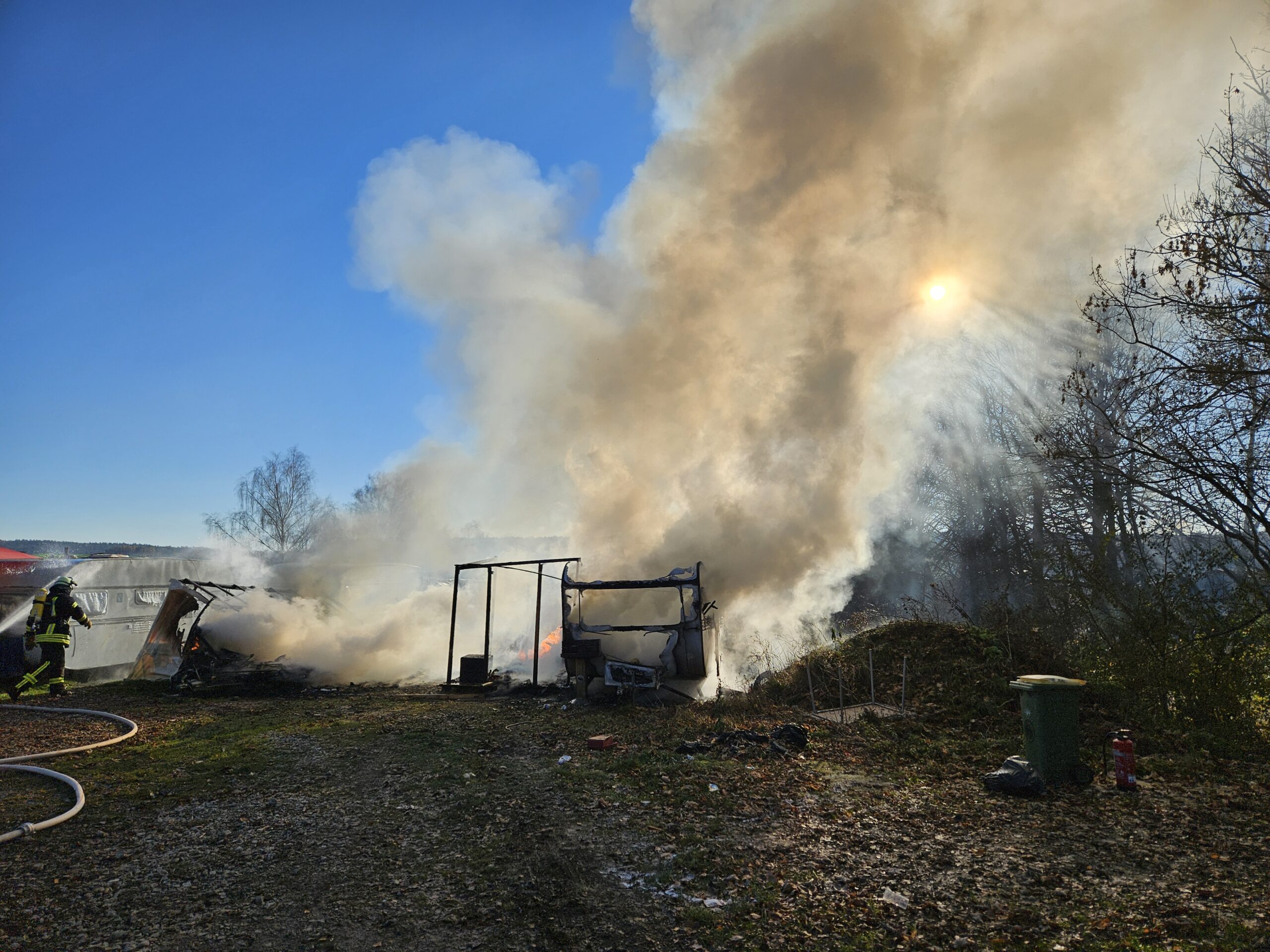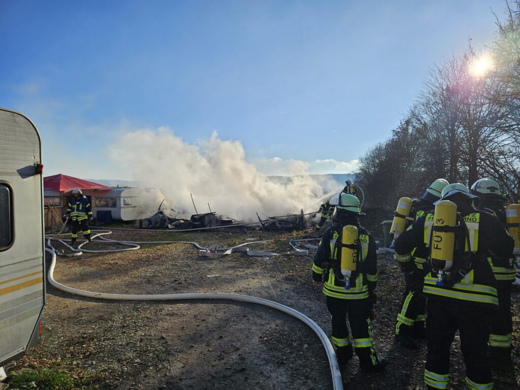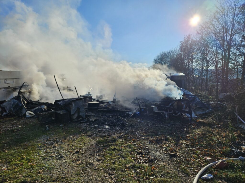 Zum zweiten Mal in diesem Jahr wurden wir zusammen mit der FF Füttersee zu einem Brand B3, Bus/LKW außerorts, ins Freizeitland Geiselwind alarmiert. Schon bei der Anfahrt war die stattliche Rauchsäule zu sehen. Beim Eintreffen an der Einsatzstelle brannten bereits mehrere Wohnwägen von Saison Arbeitern direkt neben dem Freizeitland. Von zwei Wohnwägen griff das Feuer noch auf zwei weitere über. Durch das rasche Eingreifen unserer Atemschutztrupps konnte eine weitere Brandausbreitung auf die nächsten Wohnbehausungen verhindert werden. Nach dem Ablöschen des Brandes wurde die Einsatzstelle noch mit einem Schaumteppich überzogen. Nach den Aufräumarbeiten konnte der Rückmarsch in den Stützpunkt angetreten werden, wo noch aufwendige Arbeiten anstanden.