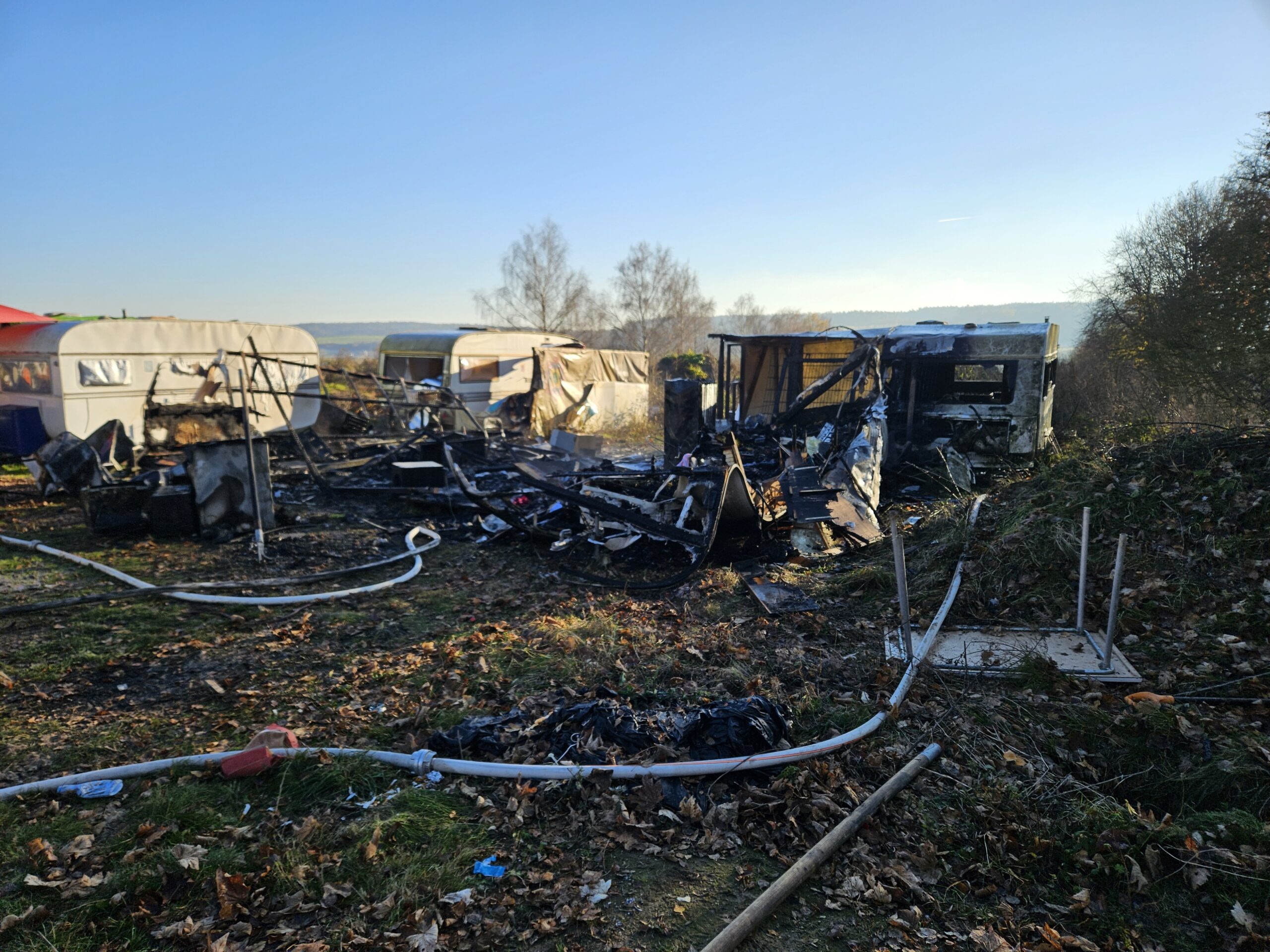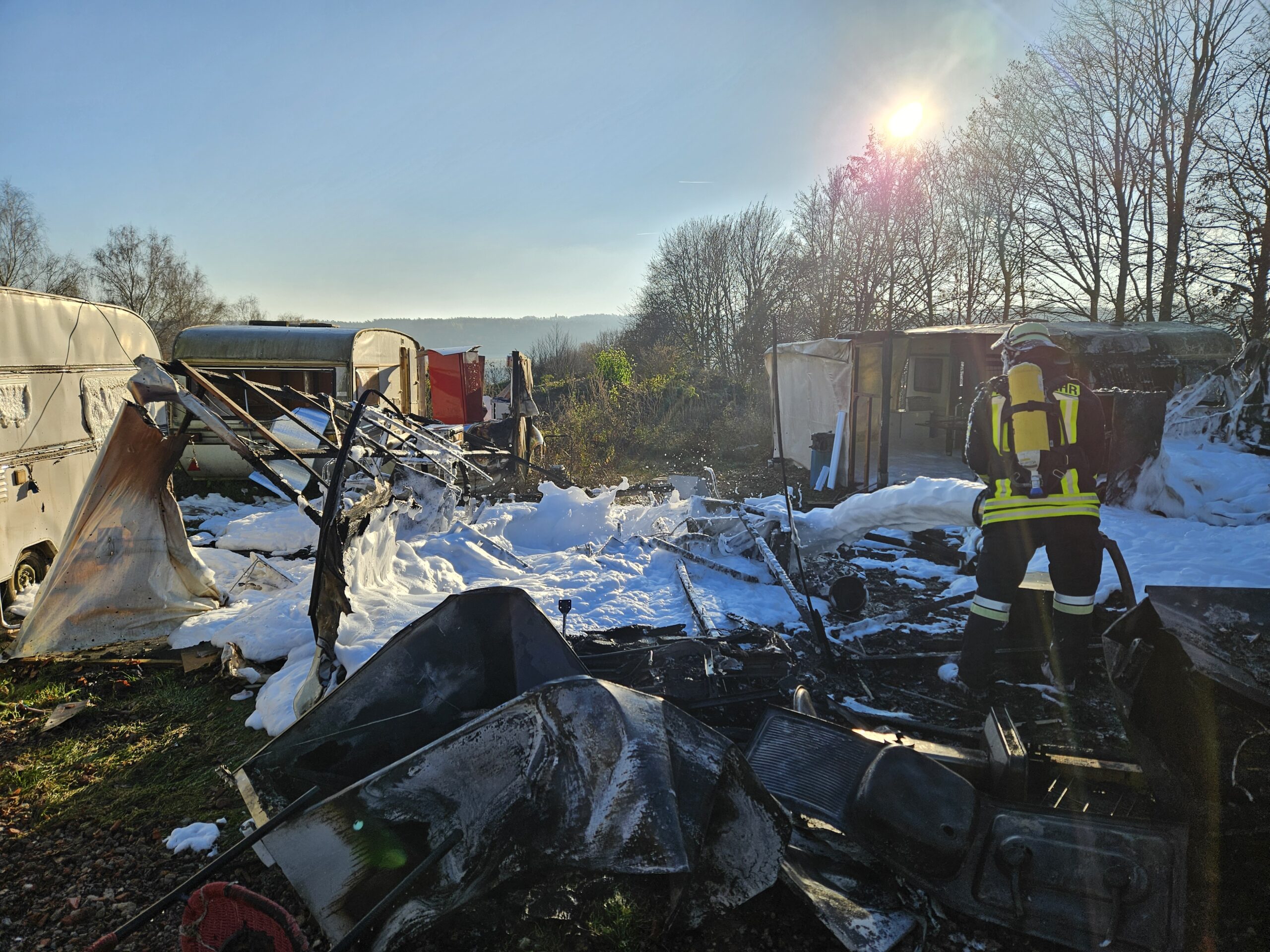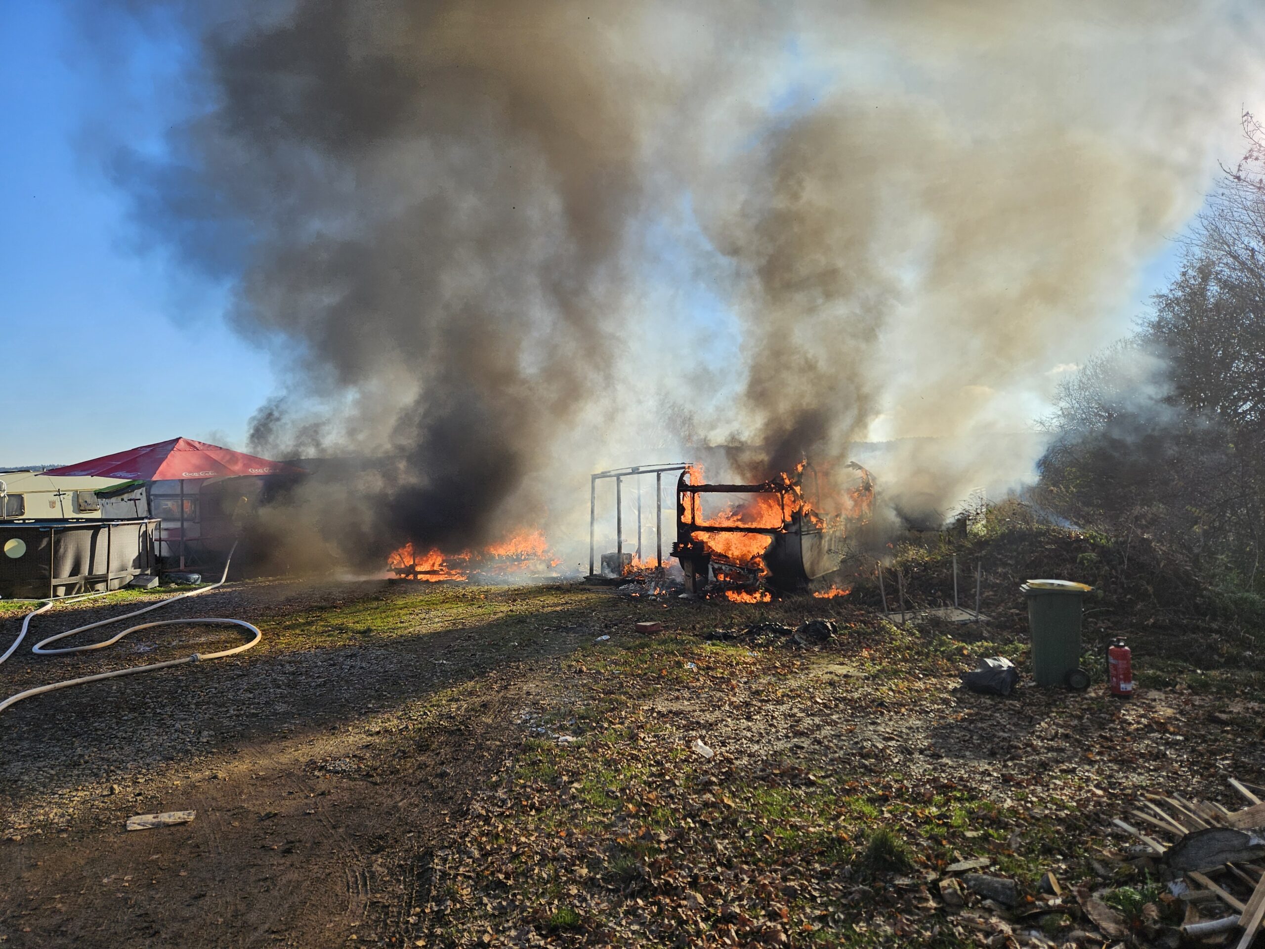 Zum zweiten Mal in diesem Jahr wurden wir zusammen mit der FF Füttersee zu einem Brand B3, Bus/LKW außerorts, ins Freizeitland Geiselwind alarmiert. Schon bei der Anfahrt war die stattliche Rauchsäule zu sehen. Beim Eintreffen an der Einsatzstelle brannten bereits mehrere Wohnwägen von Saison Arbeitern direkt neben dem Freizeitland. Von zwei Wohnwägen griff das Feuer noch auf zwei weitere über. Durch das rasche Eingreifen unserer Atemschutztrupps konnte eine weitere Brandausbreitung auf die nächsten Wohnbehausungen verhindert werden. Nach dem Ablöschen des Brandes wurde die Einsatzstelle noch mit einem Schaumteppich überzogen. Nach den Aufräumarbeiten konnte der Rückmarsch in den Stützpunkt angetreten werden, wo noch aufwendige Arbeiten anstanden.
